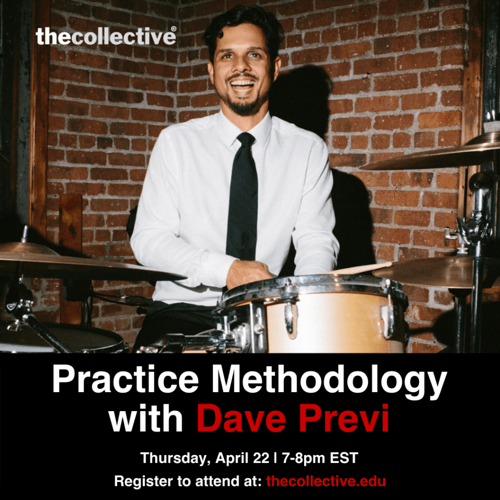 Thursday April 22, 2021, You’re invited to join The Collective School of Music LIVE online at 7-8pm EST as we proudly present a FREE hour-long clinic discussing how to Create, Optimize, and get the most out of a Drummer’s practice routine from Collective Mentor David Previ!